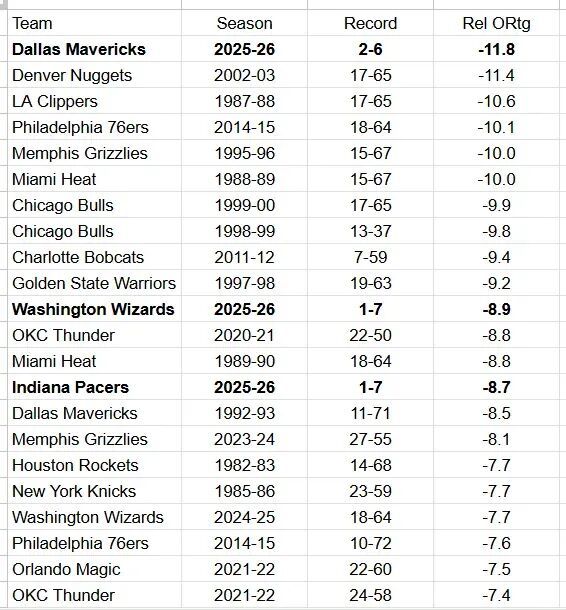 多说一句,这赛季的独行侠,开局2胜7负西部垫底,很大一部分原因就是因为进攻不行,一个数据是,本赛季独行侠的相对进攻效率(球队进攻效率-联盟平均效率)只有-11.8,这个数字不仅仅是本赛季最差,甚至还是历史最差——看至此,你大概能理解为何这才开赛不到10场比赛,独行侠就想着交易汤普森了。